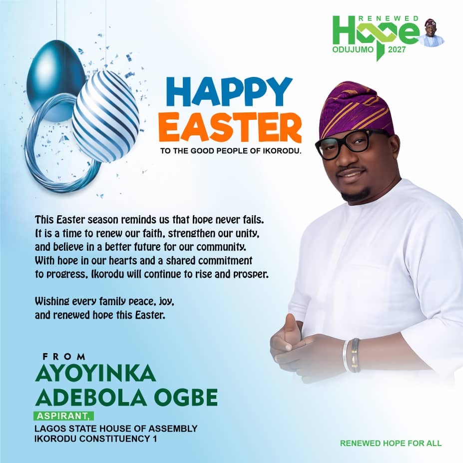 As the Easter festivities culminate today, Ayoyinka Adebola Ogbe, a prominent aspirant for the Lagos State House of Assembly, Ikorodu Constituency 1, has extended a warm and inspiring message to the people of the division.