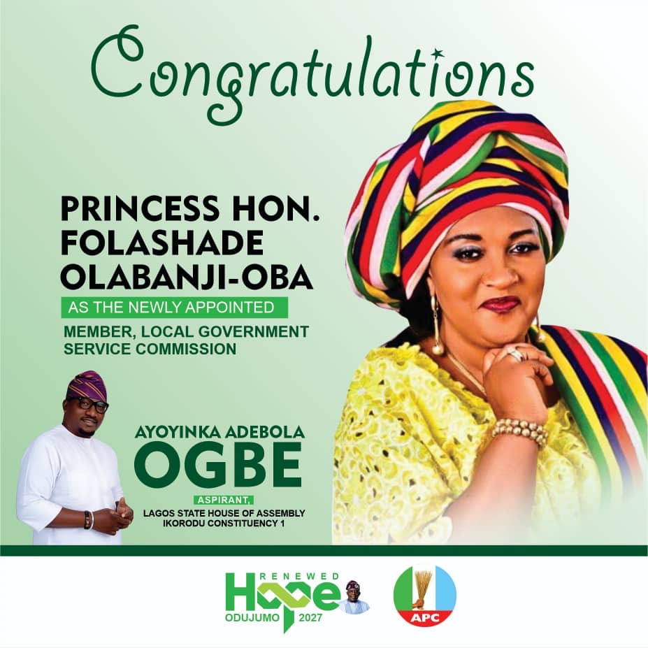 Ogbe Ayoyinka Adebola, an aspirant for the Lagos State House of Assembly, Ikorodu Constituency 1, has heartily congratulated the newly appointed Member of the Local Government Service Commission.